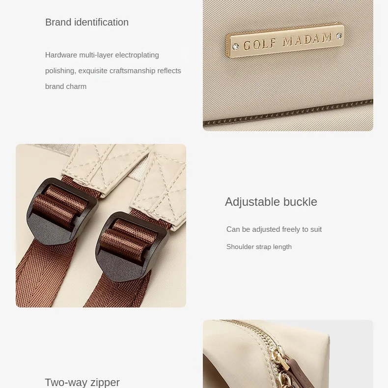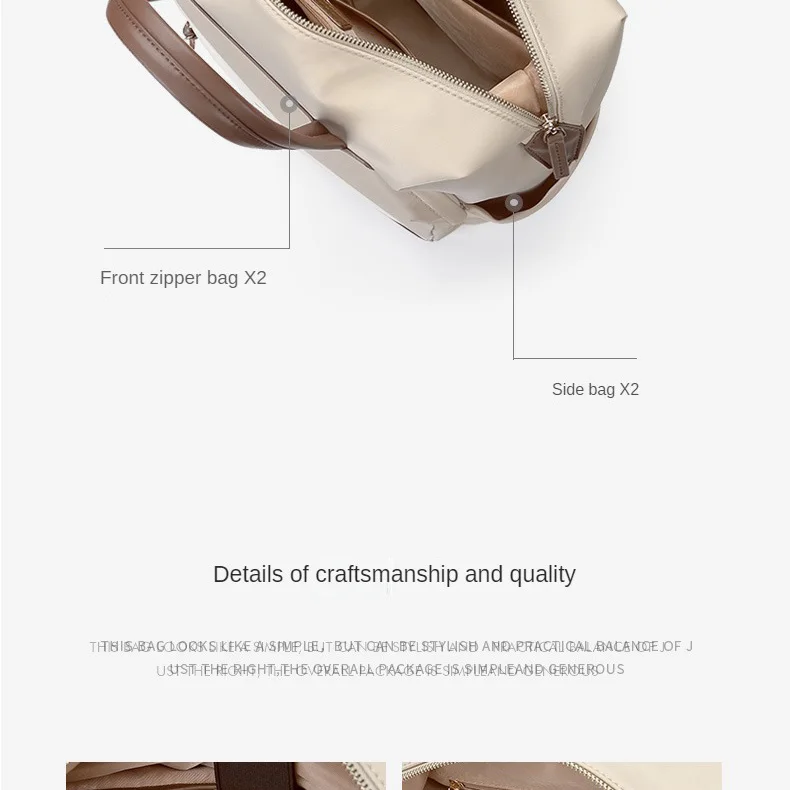 External: 1 front three-dimensional zipper pocket, 1 front zipper pocket, 2 side pockets, 1 rear zipper pocket, and 1 rear zipper strap.